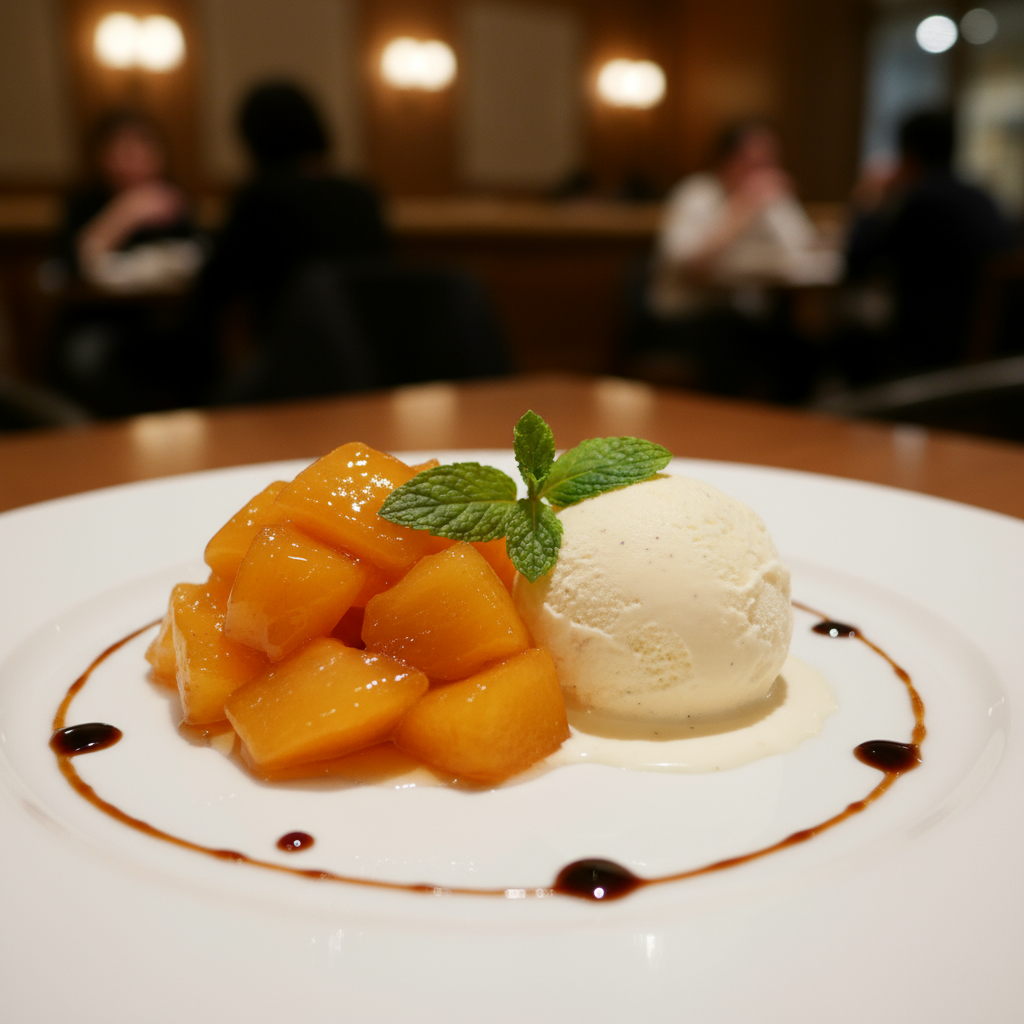 シロップでじっくり煮込んだ柿は、まるで果実のジュエリーのように輝き、冷たいバニラアイスと合わせると極上の一品に。おうちで作れる、簡単で華やかな秋のスイーツです。
