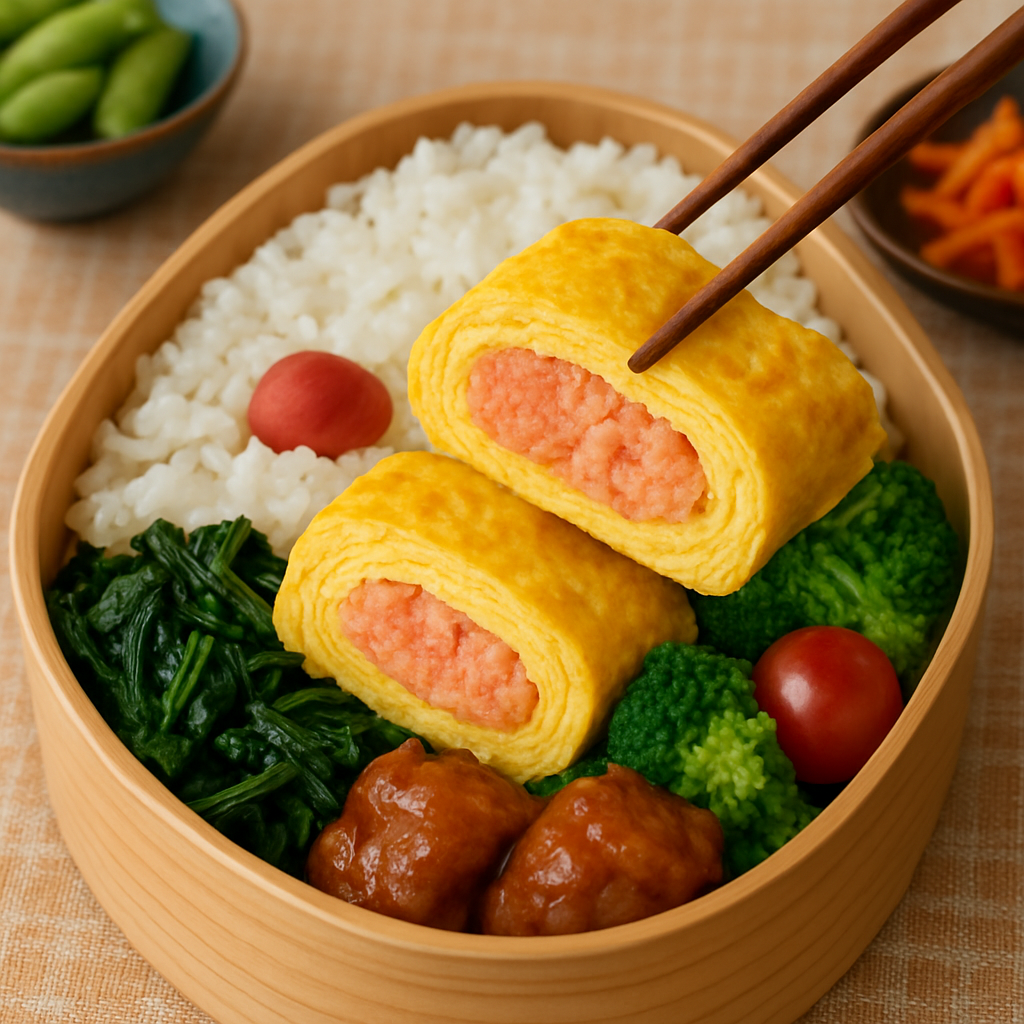 たらこは旨味成分をたっぷり含んでいるため、卵と組み合わせることで一層深い味わいを生み出します。さらに、出汁を加えることでふんわりした食感が生まれ、口に入れた瞬間にじゅわっと広がる旨味が格別です。切った断面にほんのりピンク色のたらこがのぞくため、見た目にも華やかでお弁当にもぴったりです。