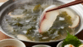 - 鍋に水と昆布を入れ、弱火で加熱し沸騰直前に昆布を取り出す。