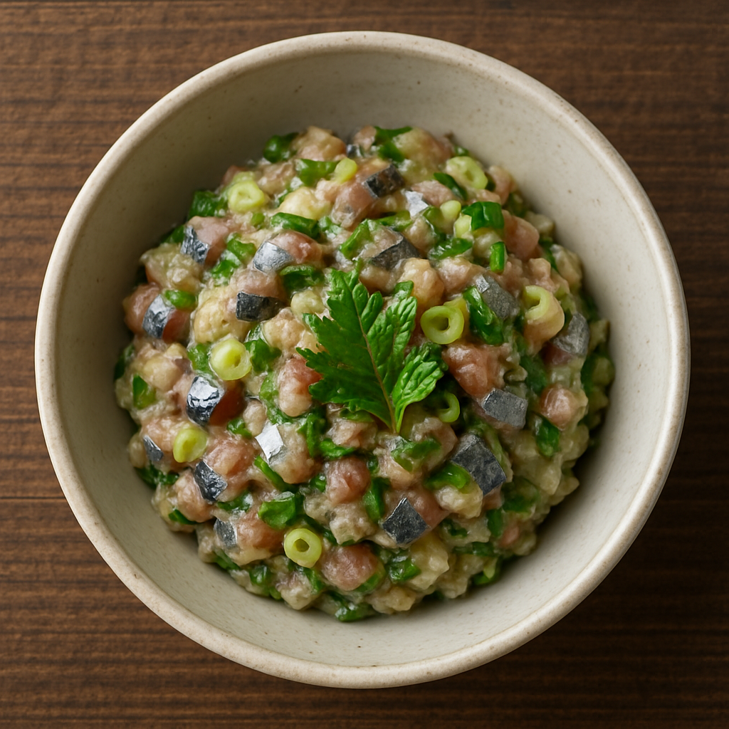 - 刻んだ生姜、青ねぎ、大葉、みょうがを加え、さらに叩いて混ぜ合わせます。