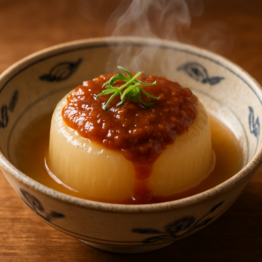 ⑤盛り付け 器に煮た大根を盛り付け、熱々の味噌だれをたっぷりかければ完成です。お好みで柚子の皮や白ごまを添えると風味が増します。