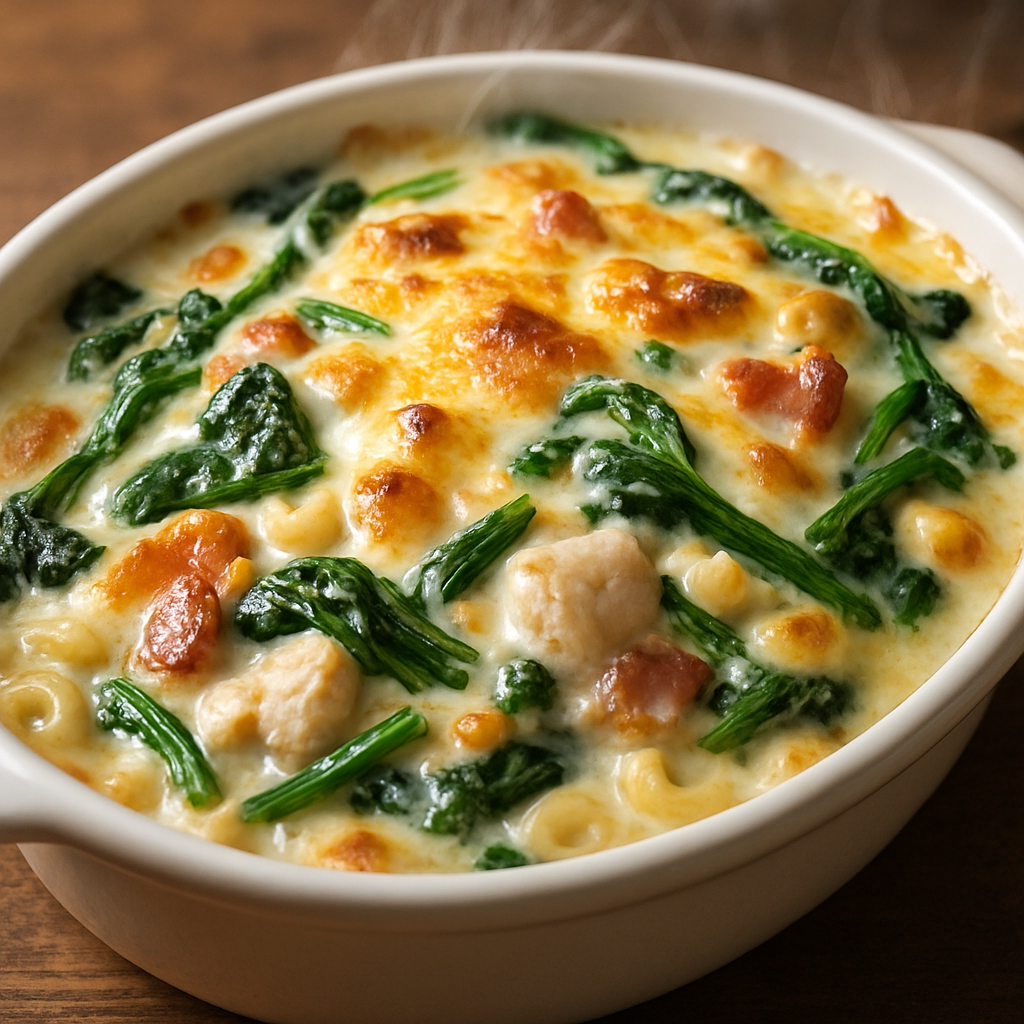 こんにちは!今回は寒い季節はもちろん、年中食べたくなるあったかオーブン料理「ほうれん草入りグラタン」をご紹介します。グラタンはフランス発祥の料理ですが、日本の食卓でも大人気の洋食メニューですよね。今回のレシピは、旬のほうれん草をたっぷり使い、バターの香りとミルクのやさしい甘さを生かしたクリーミーなホワイトソースが決め手。具材は鶏肉やベーコン、マカロニなど食べ応えのある内容に仕上げました。栄養バランスが良く、メイン料理としても満足できる一皿です。初心者さんでも失敗しないポイントを丁寧に解説しますので、ぜひ最後までご覧ください♪